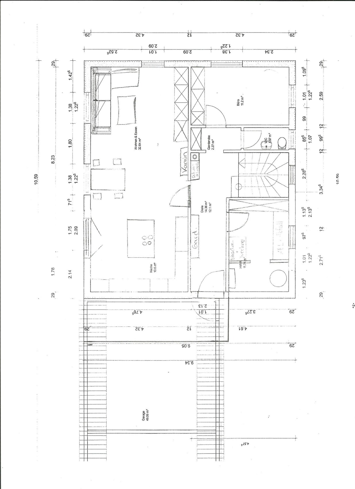 EG mit Offener Küche, Gäste-WC mit Dusche, kleines Gästezimmer und nicht zu kleinen Hauswirtschaftsraum mit Fenster und Zugang zur Garage(Grenzbebauung im Osten 6x9m)