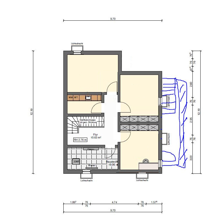 Ja genau so meinte ich das. Dann entstehen 2 gleich große Büros und der Fitnessraum würde diese sinnlose kleine Ecke verlieren. Allerdings sind die Büros recht klein, wenn sie zusätzlich noch als Gästezimmer herhalten sollen. Eine Alternative wäre wie hier im Anhang - mit separatem Waschkeller. Da könnte man einen Wäscheschacht von eurem Bad aus einplanen. Wegen Garage ist da kein Fenster möglich. Wenn man eine Kontrollierte-Wohnraumlüftung hat, braucht man das aber auch nicht. Wir haben zB in Abstellräumen, Technik und Waschkeller auf Fenster verzichtet und das funktioniert tadellos. Der Grund: Ich hasse Lichtschächte, zum einen weil sie die Terrassen und Gartengestaltung erschweren und zum anderen, weil man sie sauber machen muss und ich eine Spinnenphobie habe Ach ja, und wenn ihr da wirklich täglich arbeiten wollt, macht in jedem Fall große Fenster und eine Anböschung wie bereits empfohlen. Eine Treppe braucht es mE nicht.