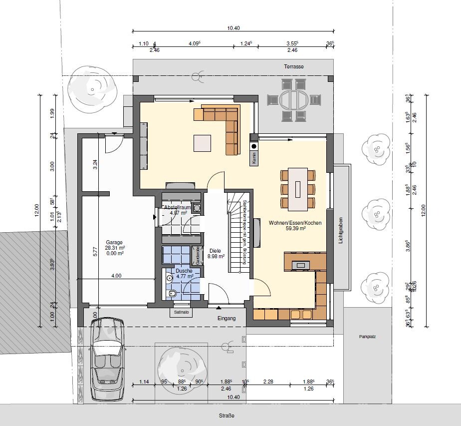 Garage ist nun definitiv gross genug für ein Auto und Fahrräder an der Seite. Gartenschuppenanbau würde ich sogar noch etwas länger gestalten.