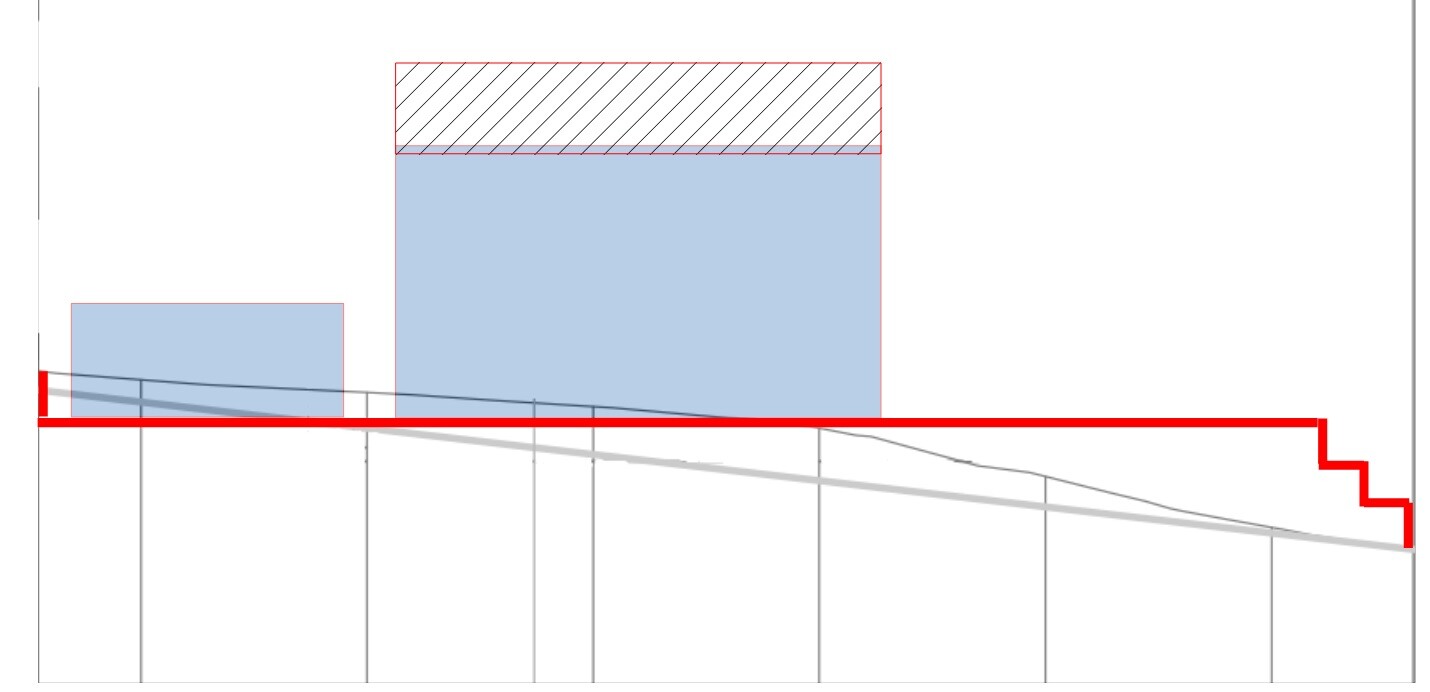 Zwei Varianten, einmal getreppt und einmal abfallend.Mit der Treppung meinte ich generell jegliche Transformation des Geländeverlaufes (oder Abschnitten davon) in Reisterrassen, nicht speziell die Abböschung in wörtlich genommenen Treppenstufen.Aber schön, daß Du es mal visualisiert hast - nun mußt Du nur noch eine Nacht darüber schlafen und dann mit Abstand noch´mal draufschauen. Wenn Du dann im Geiste die zu bewegenden Massen überschlägst, wirst Du feststellen, daß die den Rauminhalt dessen was Du damit vermeiden möchtest bei weitem übertreffen. Selbst ohne Arbeit - also nur das Zeug - wiegt das schon teurer. Pyrrhus - die Humanisten erinnern sich - hatte sein Waterloo knapp 21 Jahrhunderte vor Napoleon. Davon braucht man keinen Remix, meint die Gisela übrigens auch