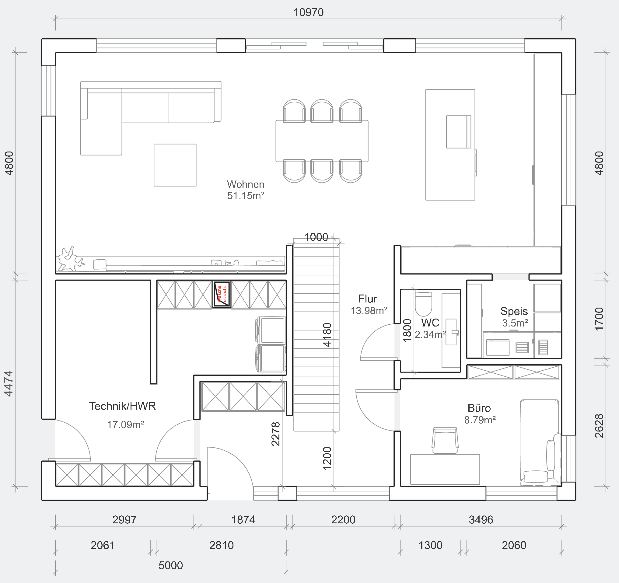 Wäscheabwurf aus AnkleideDer Wäscheabwurf ist dort schlecht geplant, wo er eingezeichnet ist. Wo wäre der Wäscheabwurf im EG? Mittig vor den zwei eingezeichneten Geräten? Und die Kinder dürfen dann natürlich auch den Elternbereich nutzen, 24/7? Ich würde da doch eher das Treppenauge und den Luftraum nehmen. Und wer es nicht macht, sondern den Weg in den Nebenraum nimmt, der müsste etwas verpeilt sein.