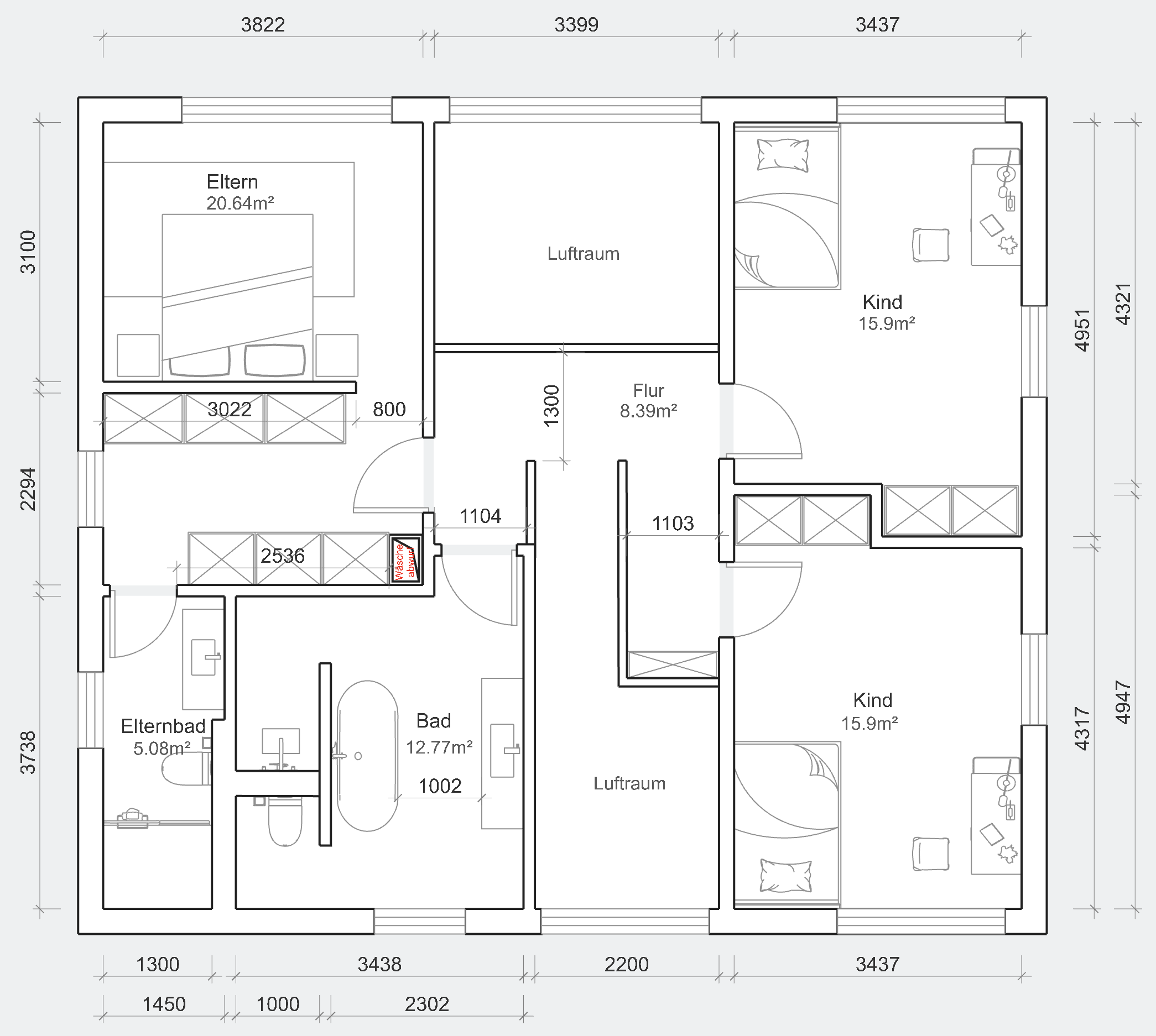 Ich hätte wahrscheinlich auf einen Luftraum verzichtet, dafür oben noch etwas Abstellfläche generiert. Bei zwei Kindern zumindest. Mit einem könnt ihr da sicherlich fürstlich wohnen.