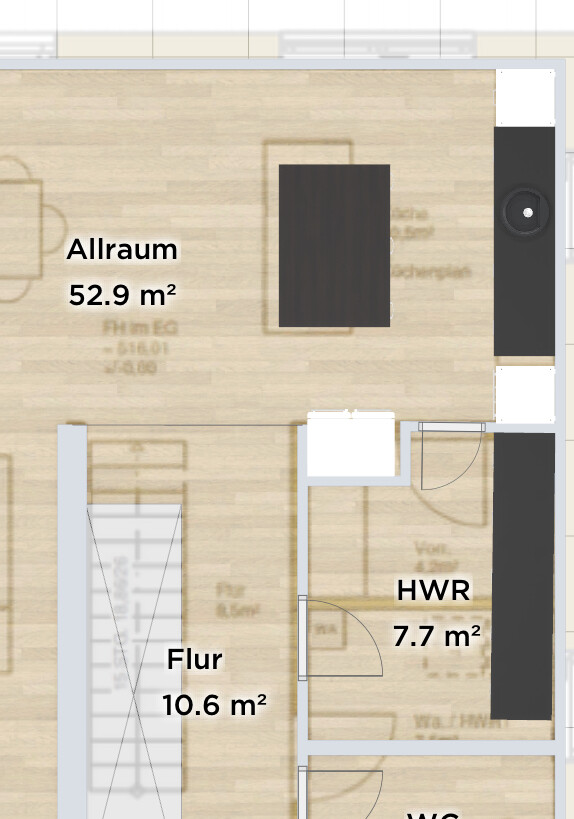 2D-Grundriss: Allraum 52,9 m² mit Flur 10,6 m² und HWR 7,7 m²