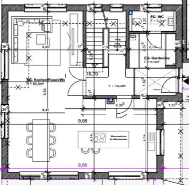 Im EG würde ich gern der Küche etwas mehr Raum geben. Bei der Treppe im Keller und EG jeweils ein Stufe mehr im Osten und jeweils eine weniger im Westen. Somit kann die Wand um 26cm verschoben werden. Dann hat man in der Küche 4,4m und die Garderobe wird um 26 cm kleiner. Dann würde ich zum WZ eine Doppeltür aus Glas vorsehen. Der Flur bleibt gleich.
