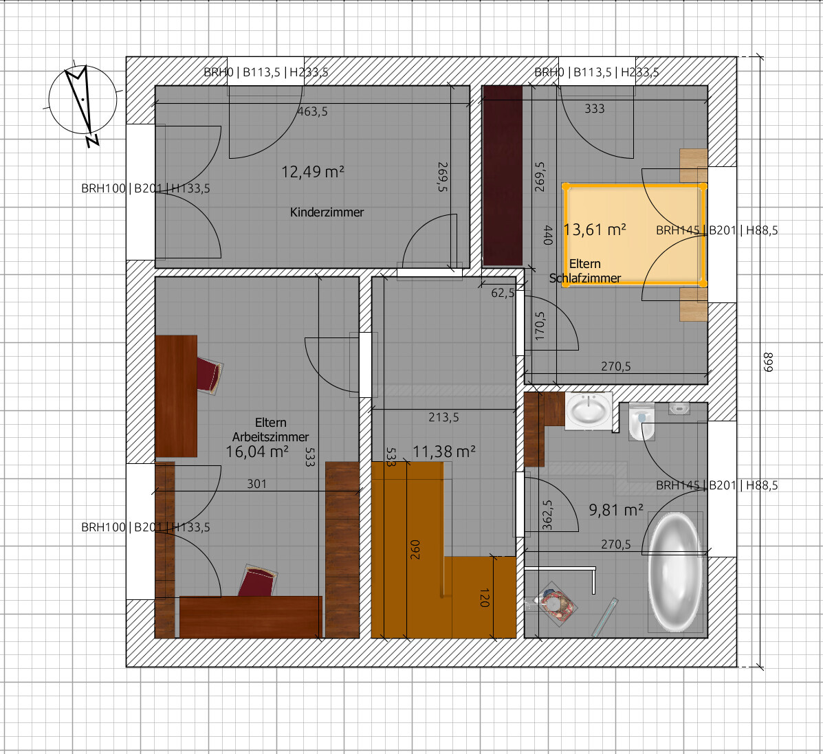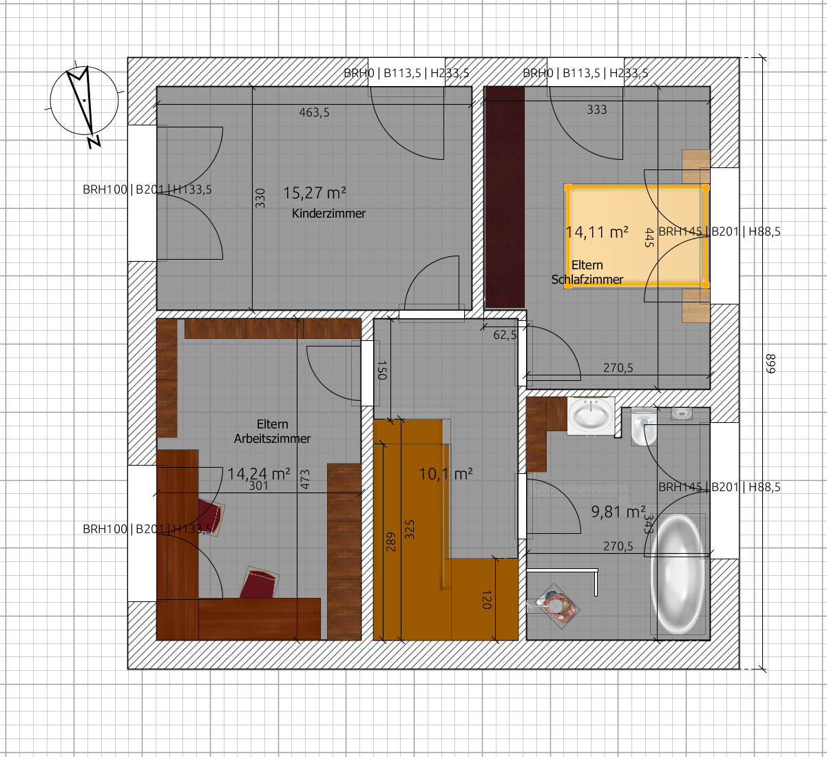 Elternschlafzimmer ist mit 333 cm Rohbaumaß sehr eng .. Bett mit Rahmen ca. 210, schrank mit Türen ca. 66 cm (Pax mit Schiebetüren), bleiben 57 cm Durchgang.