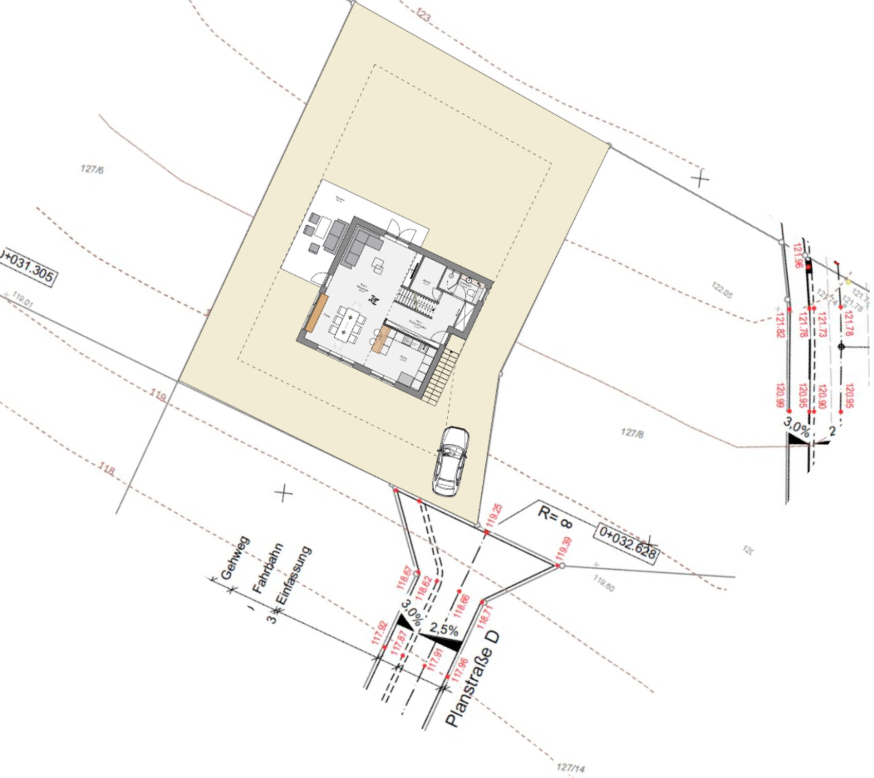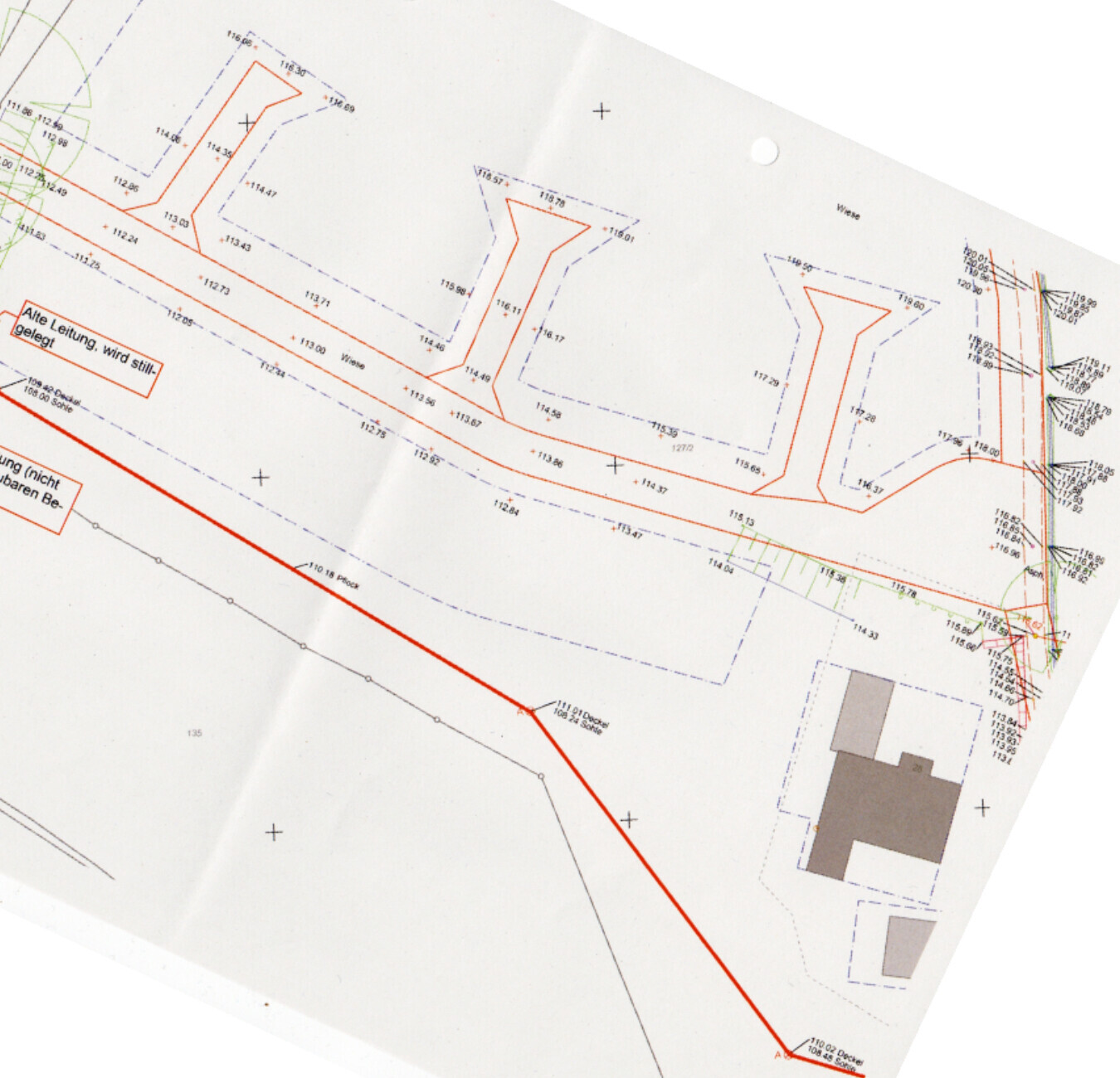 Die Höhenpunktedarstellung hat Norden nun wohl auf neun Uhr (?) und zeigt leider wenig Punkte im Grundstück - setzt sich der Hang dort etwa gleichmäßig so fort ?Sorry den Plan hätte ich drehen müssen.... Norden wäre auf der 12 Uhr Seite beim Höhenplan