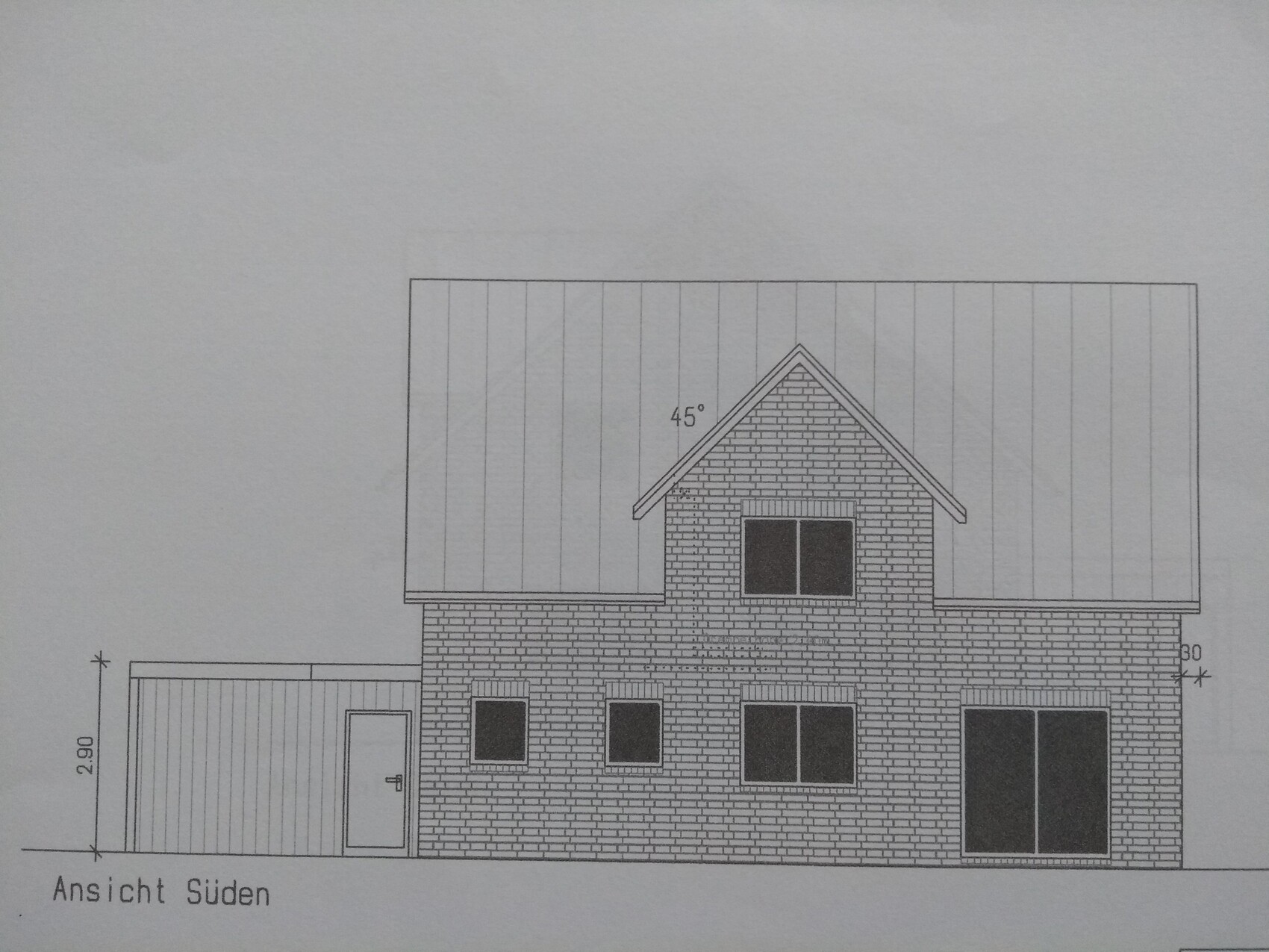 Der Grundriss EG enthält die Fenster aus der folgenden Südansicht. Bei diesem Vorschlag sind die Fenster im Gäste-WC und der Speise kleiner (Brüstungshöhe 1,25).