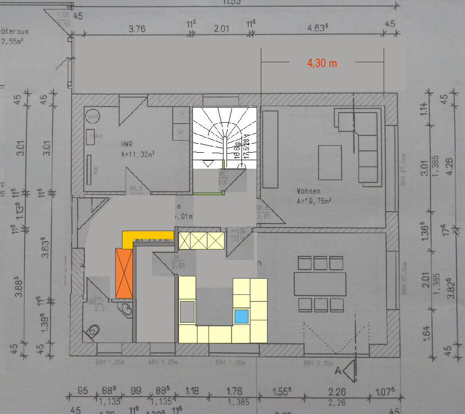 Die gedrehte Tür macht Grundstück mehr Sinn, aber nach längerem Nachdenken wollen wir sie nun vermutlich zugunsten des zweiten Hochschranks doch wieder drehen. Andernfalls wäre der Bereich für die Herdplatten und Arbeitsfläche rechts/links (an die Wand zur Speis) sehr eingeschränkt. Wie seht ihr das?