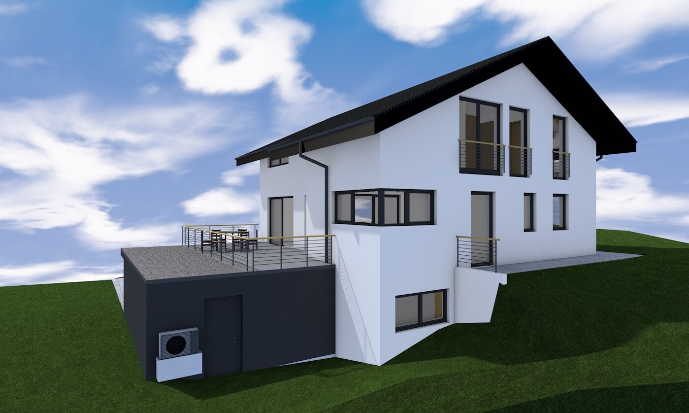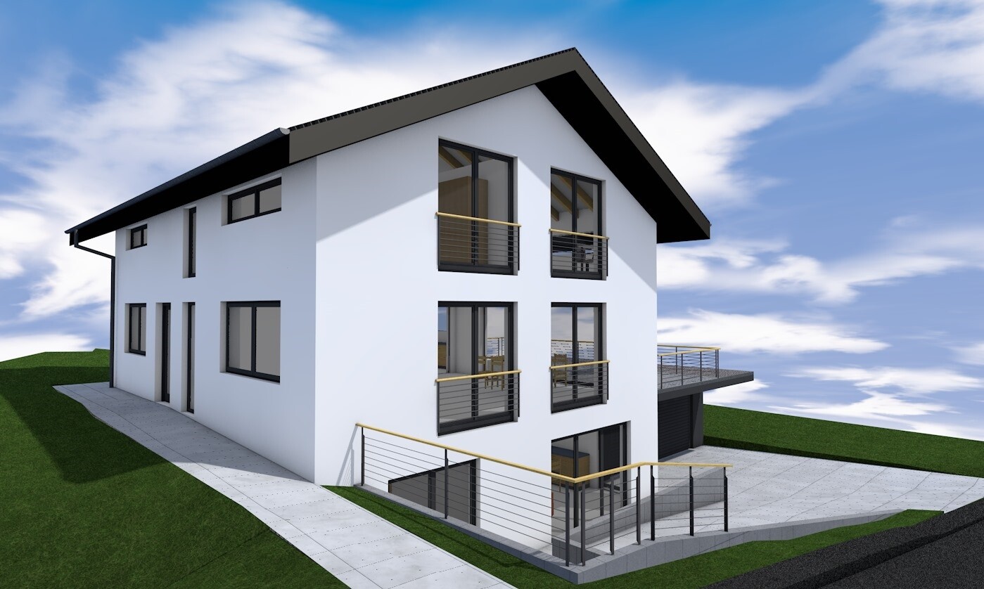 Modernes, weißes Einfamilienhaus mit dunklem Satteldach, Garage, Terrasse und Balkone