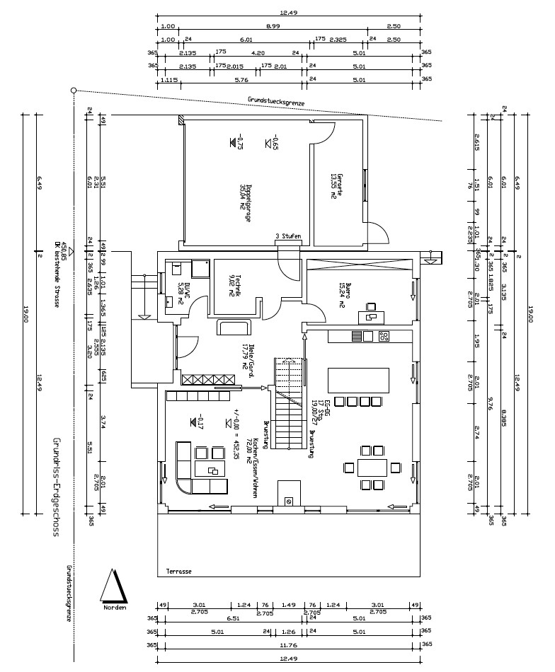 Die Räume werden 2,75m hoch. Die Treppe habe ich mit einer Breite von 1,10m und einer Länge von 4,30m eingeplant. Eventuell kann man die Treppe noch Richtung Süden schieben, so das eine Tür direkt in die Küche gesetzt werden kann.