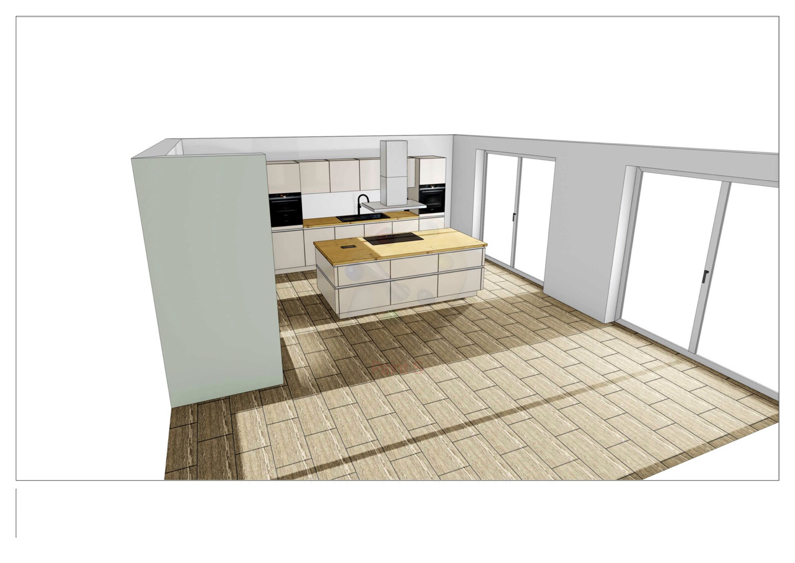 Moderne Küche mit Insel, weißen Fronten, Holzarbeitsplatten, Backofen und Kühlschrank.
