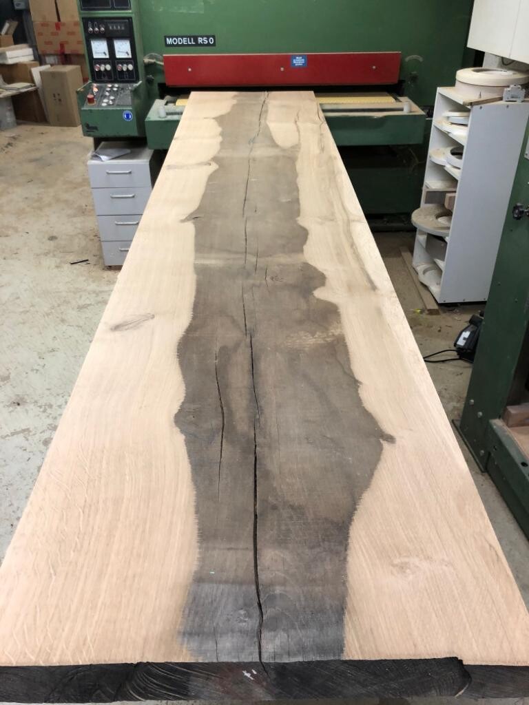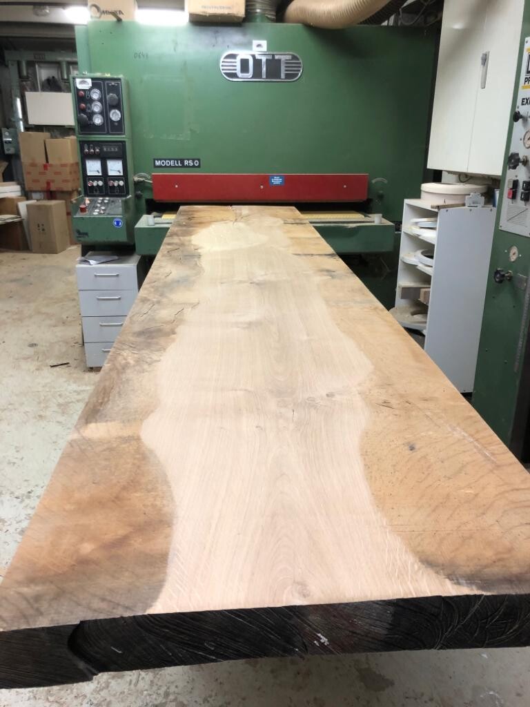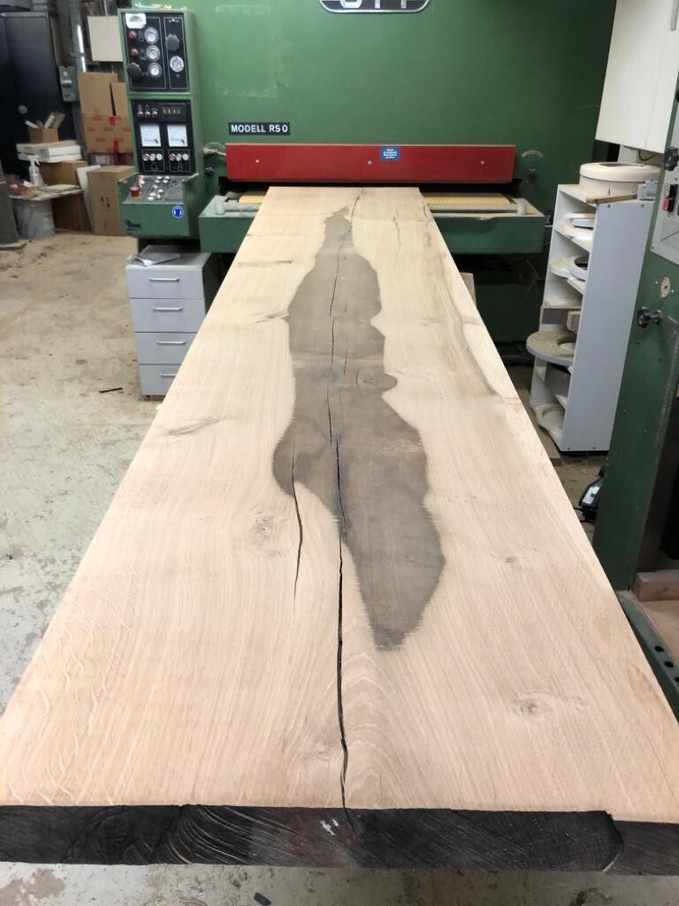 Tisch (100 x 220 cm) haben wir vom Schreiner machen lassen. Besteht aus 2 durchgehenden Balken, daher der Schlitz in der Mitte. Das ist geölte französische Eiche (kein Altholz). Die Risse und Unebenheiten sind verharzt, so dass die Oberfläche ganz glatt und pflegeleicht ist. Fuß ist aus Rohstahl. Foto folgt!