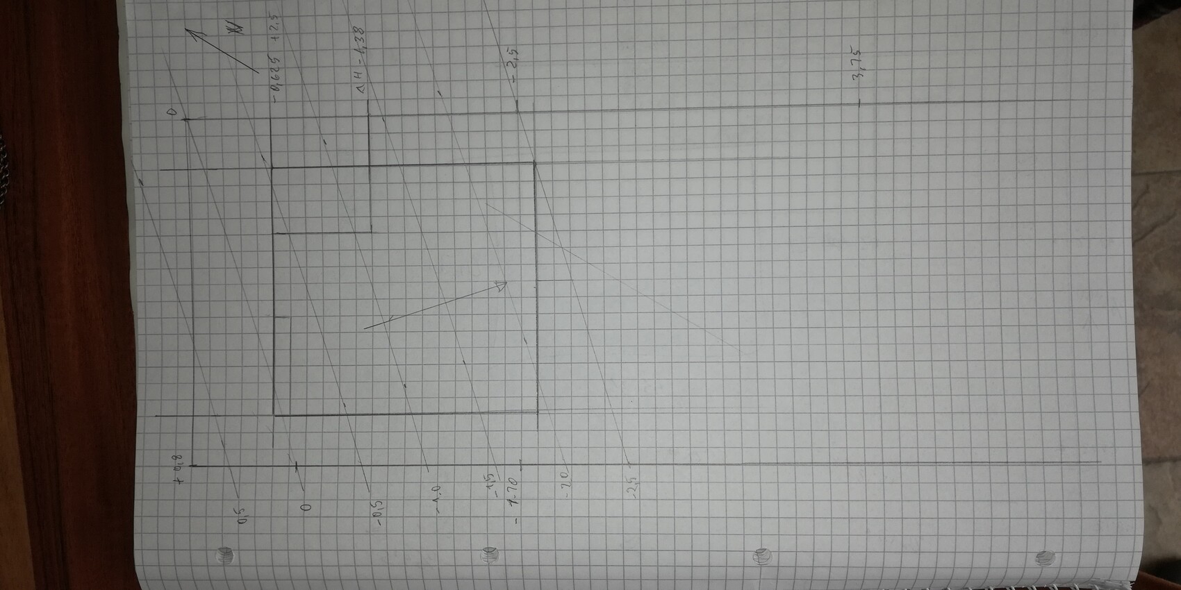 Skizze auf kariertem Papier: großes Rechteck im Zentrum mit diagonalen Linien darüber.