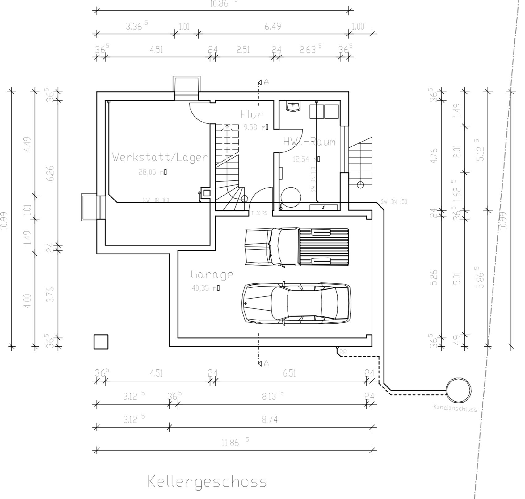Kellergeschoss-Plan: Garage mit zwei Autos, Werkstatt/Lager, Flur, HW-Raum, Treppen.