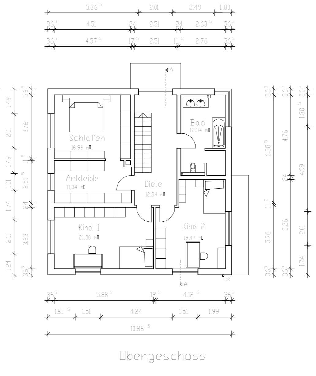 Obergeschoss: Schlafen, Ankleide, Diele, Kind 1, Kind 2, Bad; Treppenhaus in Mitte.