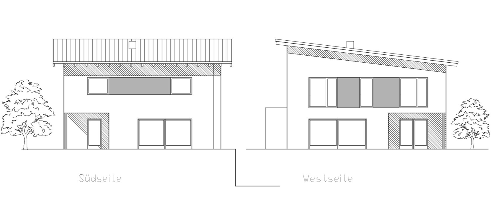 Moderne Doppelhaushälfte: Frontansichten Süd- und Westseite mit großen Fenstern und Bäumen.