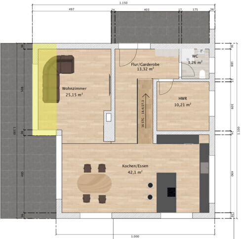 Ich wusste das die Küchen- und Wohnzimmersituation zu Meinungsverschiedenheiten führt. Hier haben wir auch wirklich lange überlegt. Ich kann deiner Argumentation voll zustimmen und weiss, dass wir hier einen Nachteil eingehen. Dennoch wünschen wir uns die Positionierung so. Ich möchte von der Küche den Blick ins Tal und zur Straße haben. Zudem möchte ich die Morgensonne in der Küche und die Abendsonne im Wohnzimmer haben. Dies ist einfach unseren Abläufen und der Arbeitssituation geschuldet. Im Dreieck im Norden verläuft ein Feldweg.