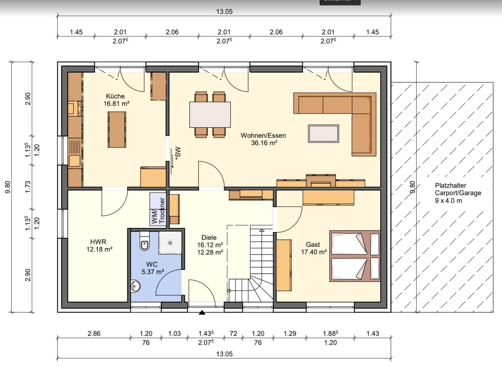 Im EG haben wir beim Hauswirtschaftsraum wieder den Weg durch die Küche. Das ist bewusst so gewählt da wir so das Gäste-WC etwas größer bekommen. Küchenplanung kommt noch, gleiche gilt für Badplanung. Leider hat der Planer wieder seine Standard Bad möbel in den Grundriss eingebaut. Wo so nicht gewollt, werde das auch noch mal ansprechen.