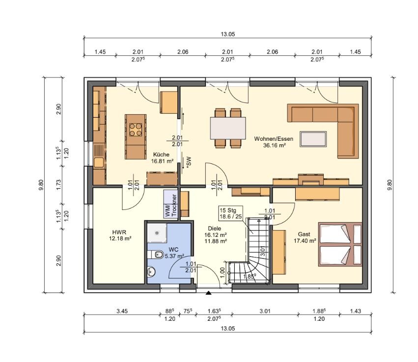 - Dadurch geänderte Terrassentürhöhen/Haustürhöhe und Fensterhöhen in jeweils Standardhöhen