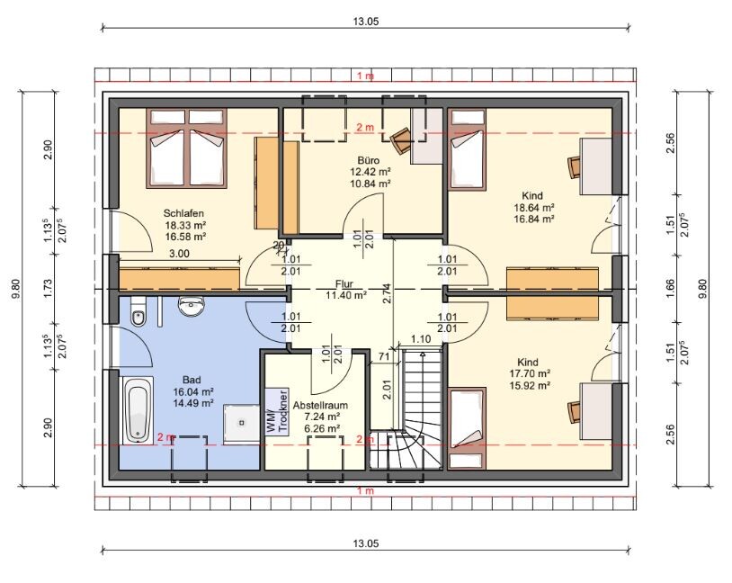 Anmerkung zur Treppe: Die Breite des Treppenlochs hat der Planer im Bereich Dachfenster bei der Treppenbreite auf 110cm festgelegt, damit man das Dachfenster besser erreichen kann. Auf die Kopffreiheit bzgl. Durchlaufhöhe der Treppe hat das keinen Einfluss. Der Rest des Treppenlochs hat die Breite von 110 cm. Macht das aus euer Sicht Sinn oder spricht was dagegen?