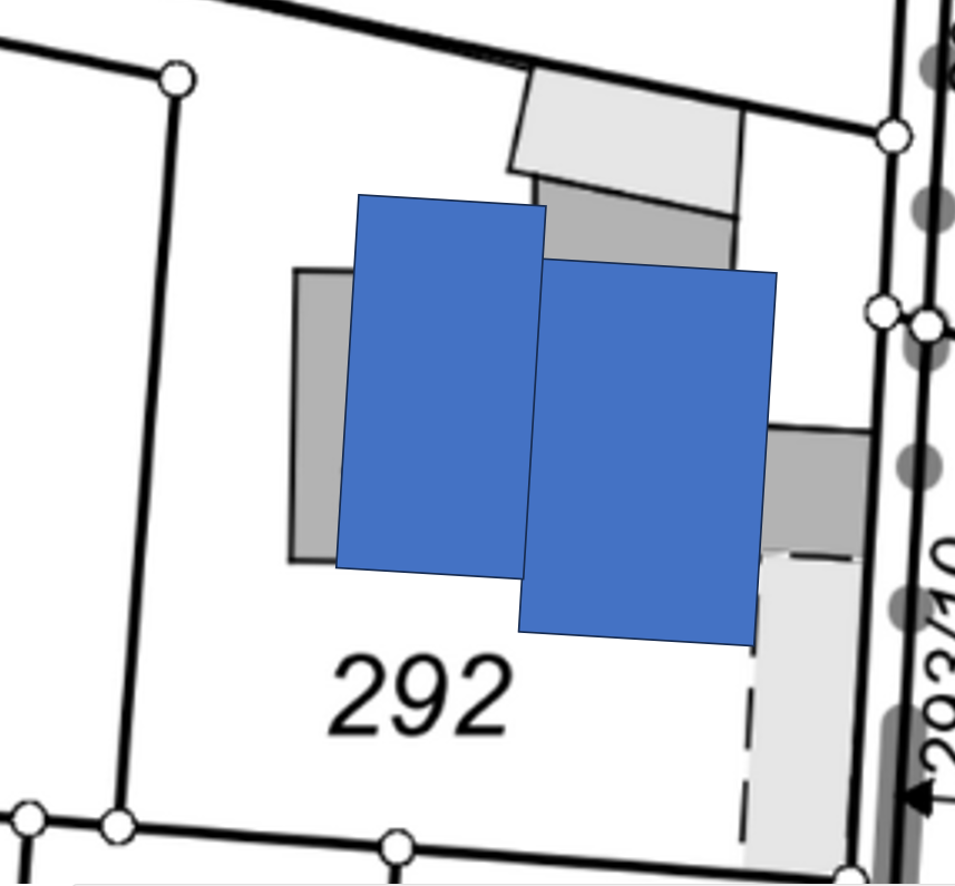 Dann habe ich mir mal den Grundriss mit einem Tool skaliert und stelle fest, dass - man sieht ja den schrägen Anbau im Westen, wo man sich schon fragen muss, was es für einen Grund dafür gibt, ihn angewinkelt verlaufen zu lassen - also dass auch der Hauptgebäudekörper mit Eingang Essbereich und co keine 90 Grad-Winkel in den Außenwänden hat. Er es ist keine rechteckige Grundfläche, sondern ein verzogenes Trapez, wie auch der "Anbau", der ein verzogenes Trapez ist.