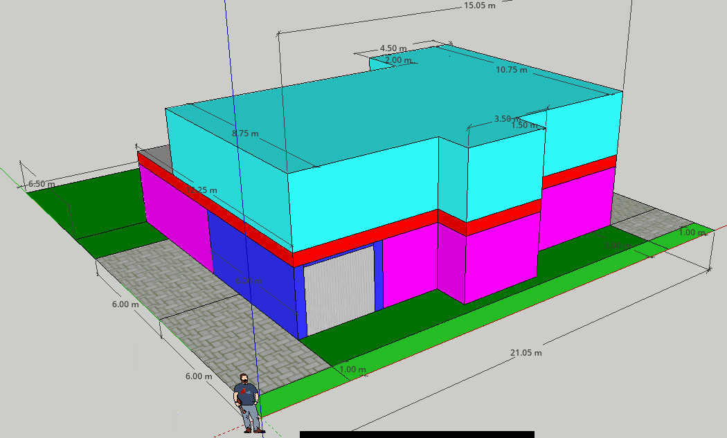 Ich habe das Treppenhaus jetzt mal 1,5 m rausgezogen und 3,5 m breit gemacht. Obwohl dieses Treppenhaus im Norden sein wird, stelle ich es mir trotzdem schön vor. Hier ist der erste Entwurf für 458 m², was bei GRZ 0,4 ein bisschen unter 183 m² erlaubt.