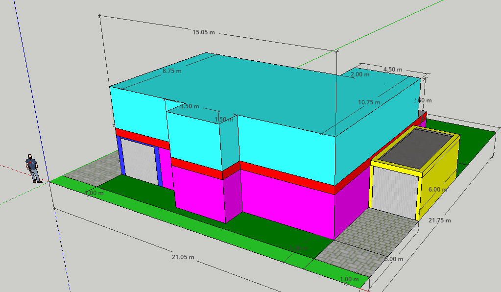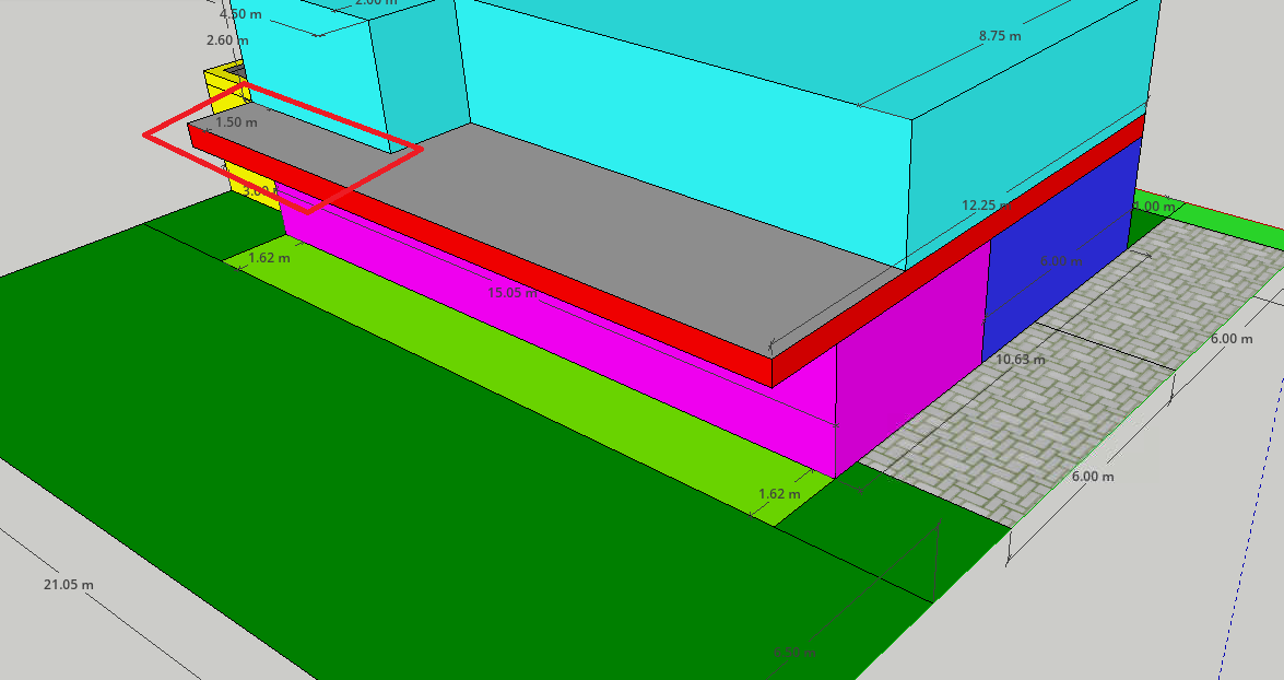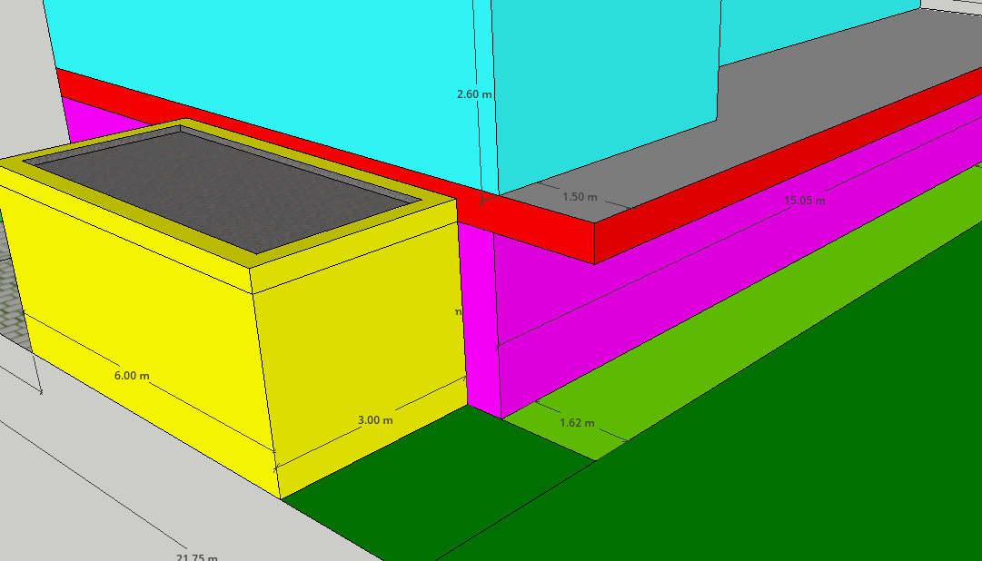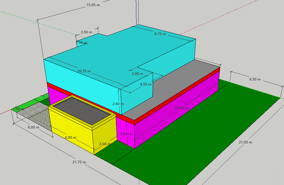 • Gelb ist eine Garage, mit wasserabführenden Steinen davor, vermutlich mit Carport drüber.