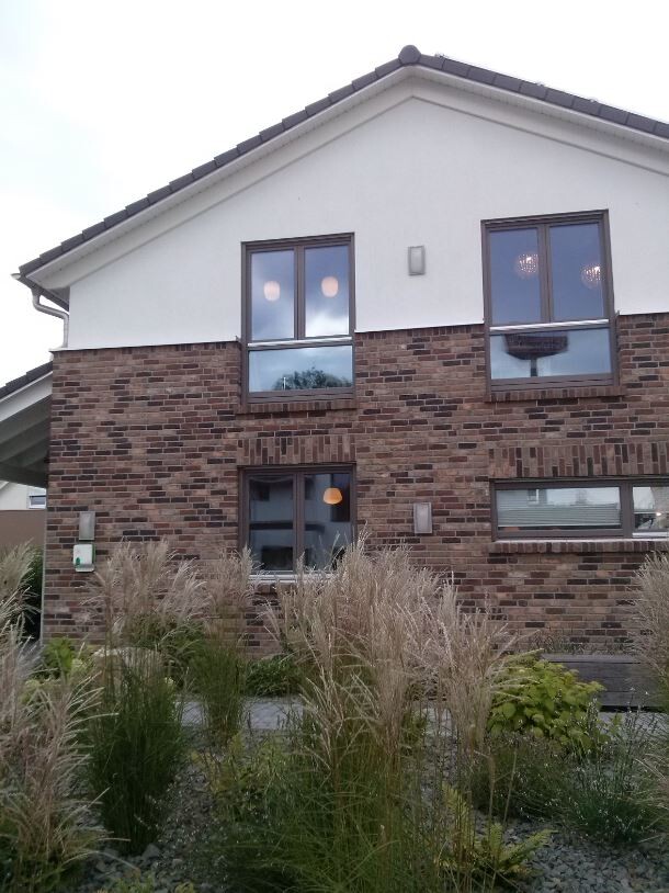 Zweistöckiges Haus mit braunen Ziegeln, weißem Giebel, großen Fenstern; Vorgarten mit Gräsern.