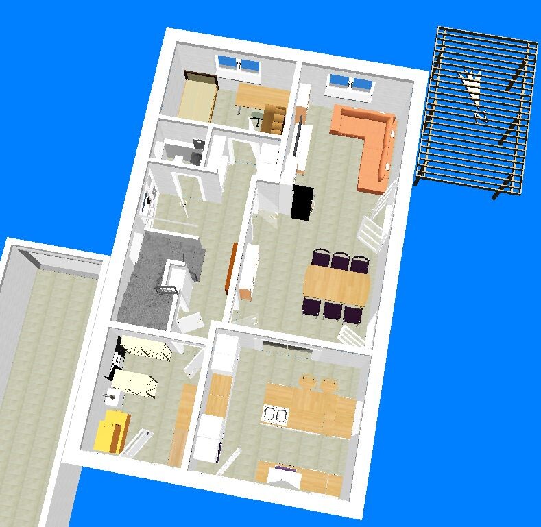 Dazu Spüleninsel mit Sitzbank an der linken Wand und 2 Stühlen nach planunten. Planoben dann eine Kochfeldzeile, außerdem direkten Gartenausgang, Verbindung zum Essbereich durch Glasschiebetüren.