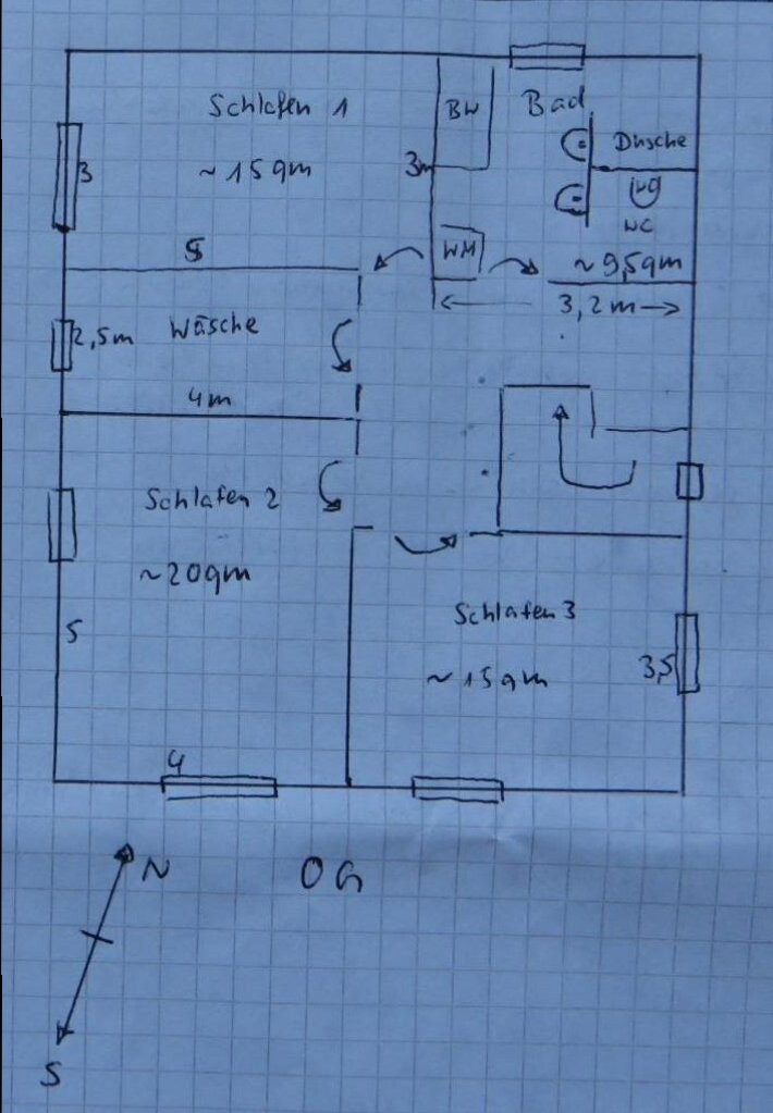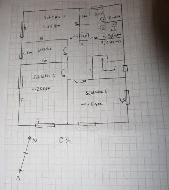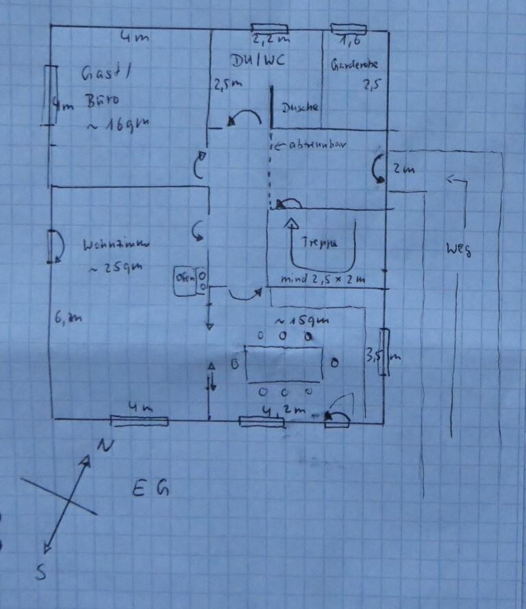 wir suchen Ideen und Meinungen zu unserem Grundriss. Die Zeichnung stammt vom Bauunternehmer nach unserer Bleistiftskizze