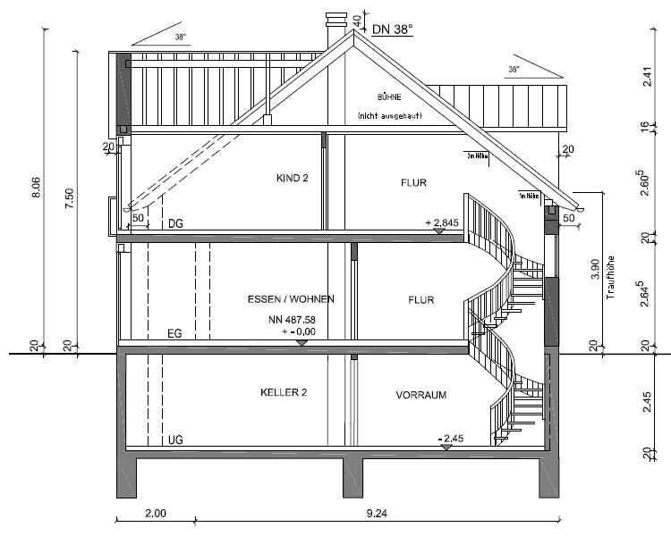 Nein, das läßt sich aus dem Schnitt nicht vollständig errechnen. 284 cm Geschosshöhe, ich habe nur 14 Steigungen gezählt = 20,2 cm .. relativ hoch, wichtig ist aber auch das Auftrittsmaß der Treppe.