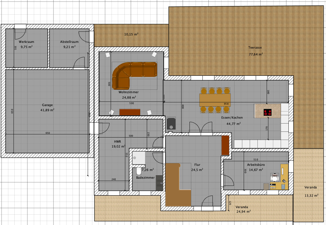 Grundriss eines Hauses mit Wohnzimmer, Küche/Essen, Büro, Flur, Bad, HWR, Garage, Veranda, Terrasse