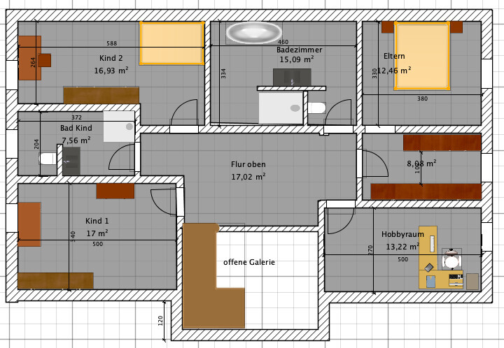 Grundriss eines Hauses mit Flur, offener Galerie, Elternzimmer, Kinderzimmern, Bad und Hobbyraum.