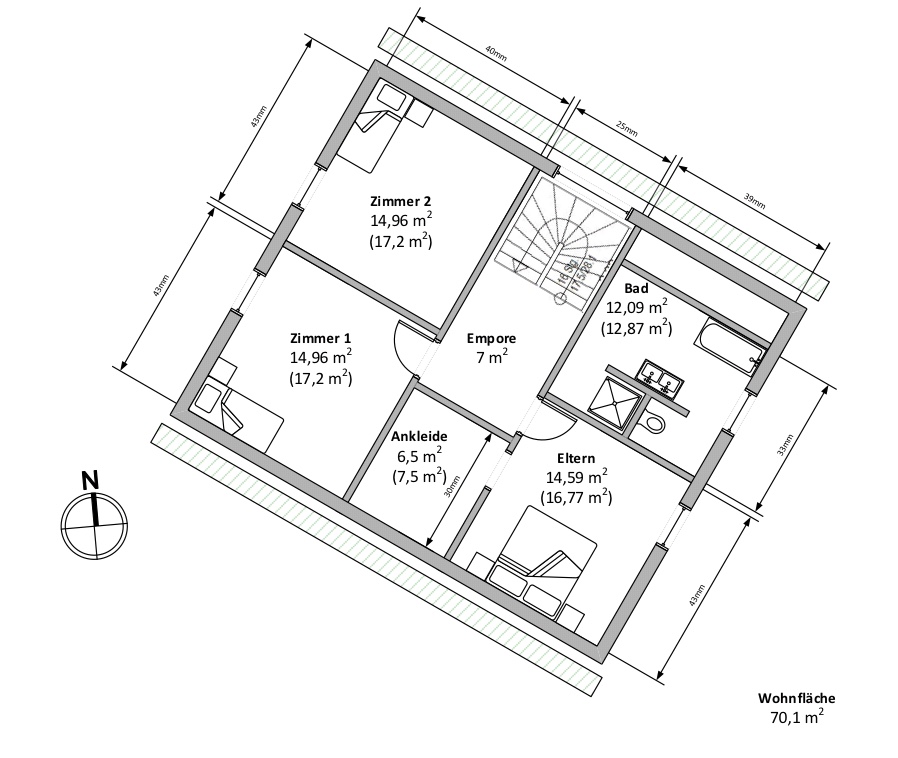 2D-Grundriss eines Hauses mit Zimmern, Bad, Empore und Elternzimmer