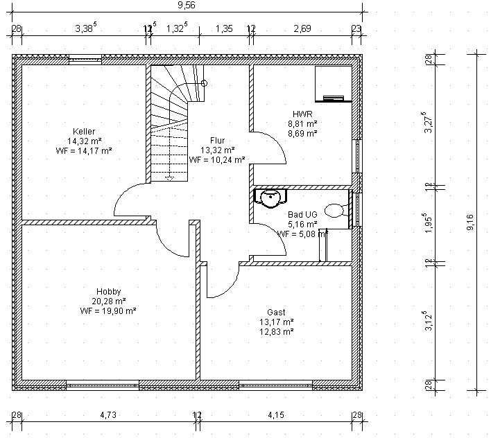 Grundriss Untergeschoss: Flur, Keller, Hobby, Gast, Bad UG, HWR und Treppe.