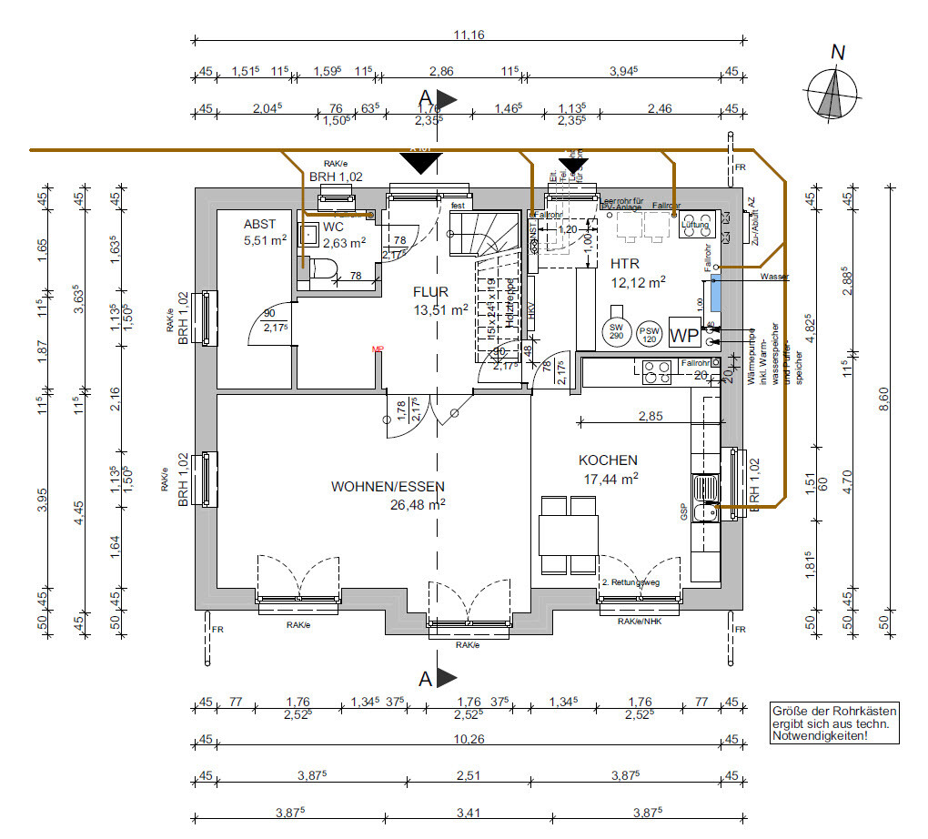 Das Viereck Abst/WC/Garderobe hatte ich erst umgestellt, um den Abst. (dann als Gästezimmer) breiter zu kriegen (WC in die Hausecke, Garderobe davor, Abstellraum zwischen WZ und dem Schlauch WC/Garderobe) aber das passt wohl oben mit den Rohren nicht. Dann wäre das Entlüftungsrohr entweder mittig an der Außenwand von Kind II oder, wenn man das Fallrohr/WC in die Ecke macht, müsste ein kompletter Kanal an der Wand von Kind II entlang gehen, da die WaMa noch den Abfluss nach unten braucht. Ein extra-Abflussrohr nach unten von der WaMa würde, mit Gäste-WC in der Hausecke, durch den Vorraum davor laufen, sodass der Gang wieder breiter müsste und der Abstellraum auch wieder schmaler werden würde.