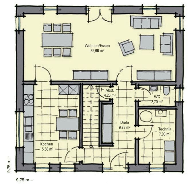 Ich persönlich mag auch das offene, bin aber wie nur zu zweit. Wir haben es auch offen mit der Treppe, und da hört man oben den TV. Eure Kinder werden auch mal älter, wollt Ihr regelmäßig den Besuch am Abend sehen und Euch stören lassen?