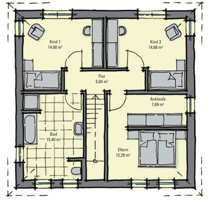 Warum macht ihr es euch so schwer und nehmt nicht einen Standard-Grundriss? Man hat da sicher auch viele Möglichkeiten der Variation. Mit kleinerem Wohnbereich könnte man auch einen Grundriss finden, wo noch ein kleines Büro ins EG passt. Ich habe exemplarisch mal einen Grundriss hier...