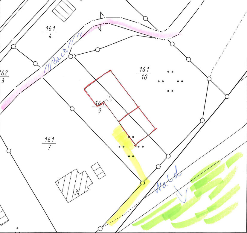 Das Grundstück liegt in einem Tal und wird auf der einen Seite begrenzt durch einen Bach und auf der andren durch einen Wald, auch nach hinten.