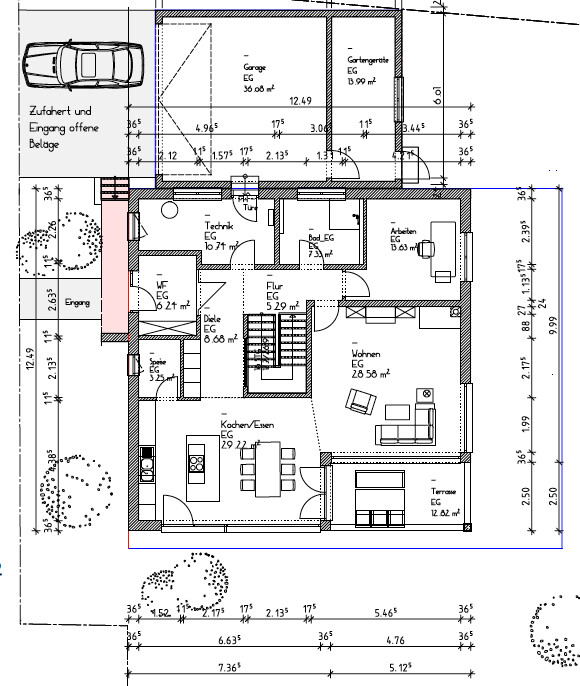 In den angehängten Zeichnungen habe ich die Treppe abgeändert, da mir auch der schmale und leider einzige Zugang im EG in Küche und Wohnzimmer zu schmal mit der Podesttreppe vorkommt.