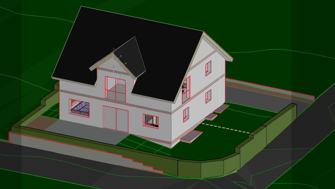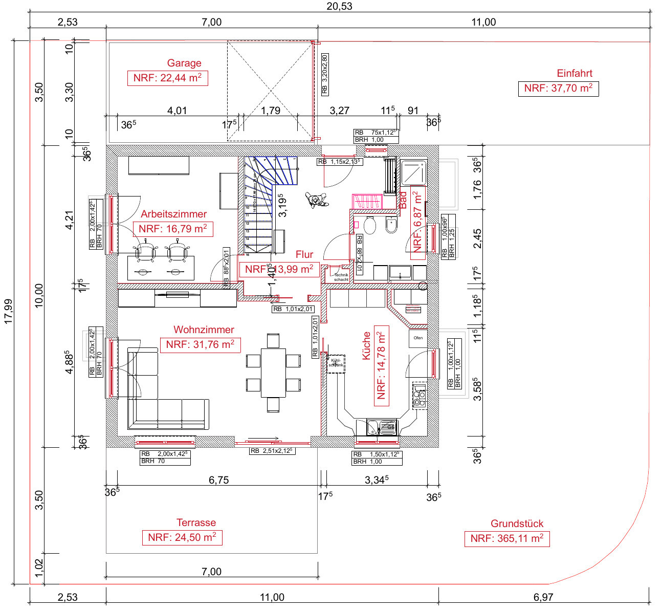 Grundflächenzahl 0,3 ergeben bei euch knapp 110qm, also eure Hausgrundfläche. Garage, Einfahrt, Terrasse? Apropos Terrasse, die benötigt auch Grenzabstand, da passt die Animation also nicht so ganz.