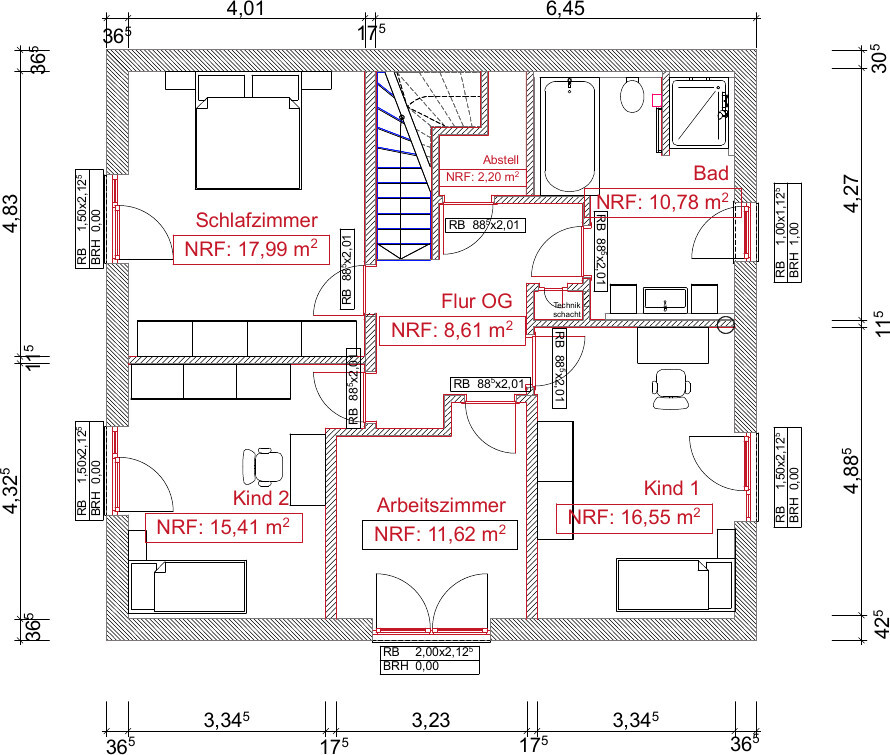 Das OG ist ein bissl zu "eckig". Prüf doch mal, wie viel Stufen Du überbauen kannst, so dass noch ca. 2,10m Kopffreiheit für den Treppenaufgang bleiben. Entsprechend die Wand vom Abstell versetzen. Die Klappe für die Technik sollte in den Flur versetzt werden und entsprechend die ganze Wand vom Bad gerade gezogen. Die Wand vom Arbeitszimmer würde ich auch begradigen. Im Bad würd ich das Fenster genauso groß machen, wie nebenan.