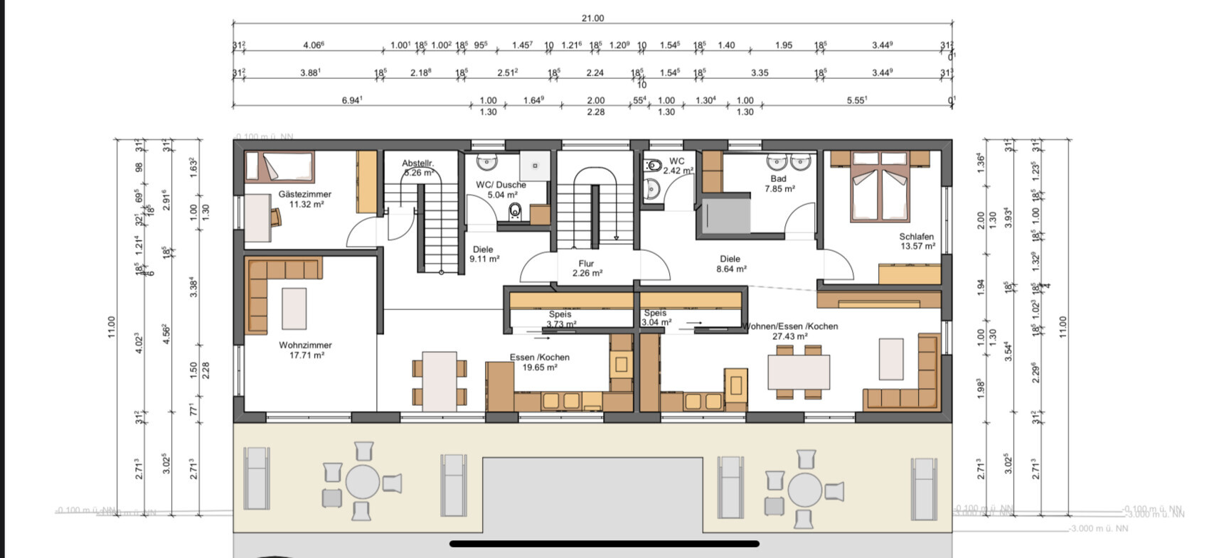 Insgesamt finde ich an dem Entwurf nicht so viel Gefälliges: Eingangsbereich viel zu groß, Treppe als merkwürdigen Fokus da hinten im Dunkeln, schmale Küche, kein Essbereich, eher eine Essecke, die den Zugang zur Terrasse blockiert (Platz für eine Ummöblierung gibt es da nicht wirklich), Seniorenwohnung kaum Stellfläche für Kleiderschrank und der Allraum ist ja irgendwie auch nicht nett.