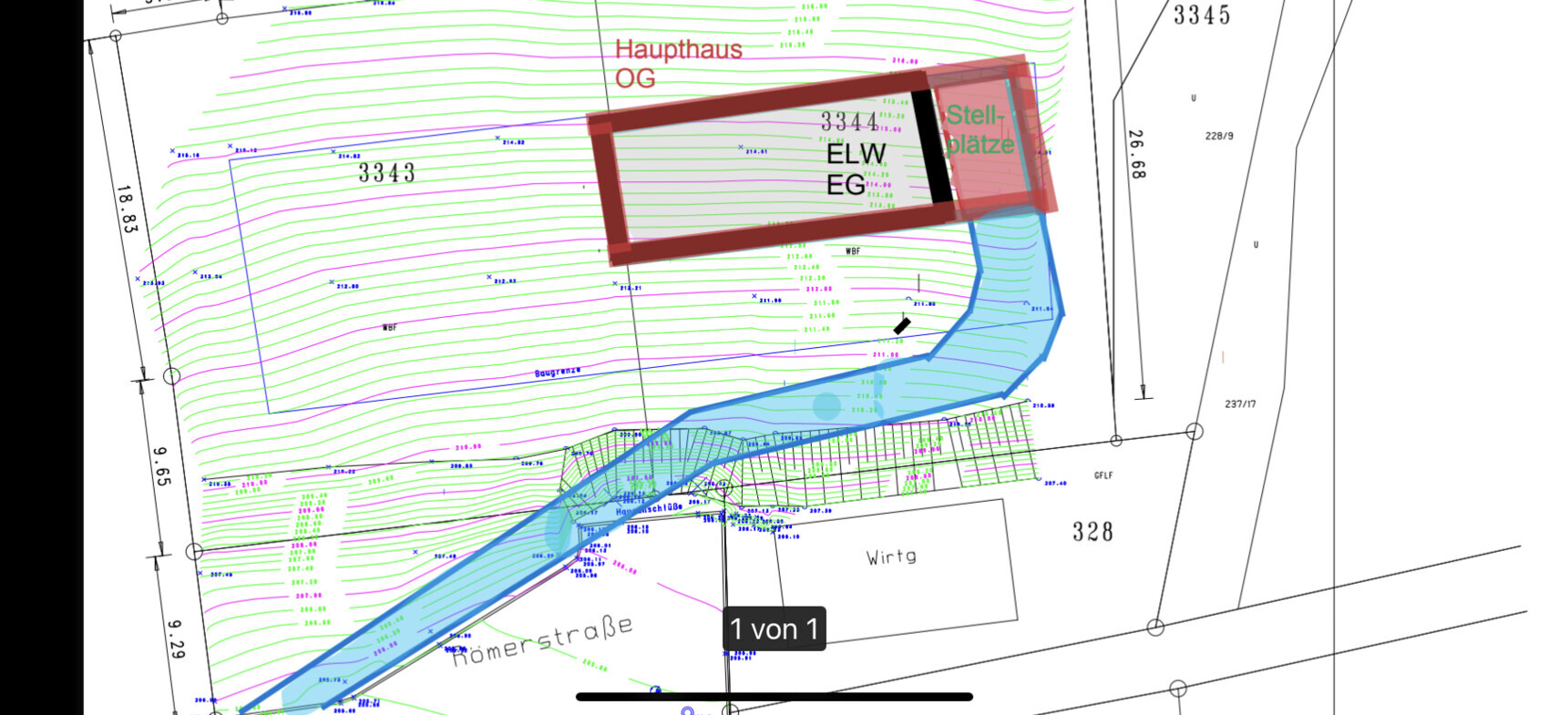 OK, hab meinen Fehler gefunden - die 2,80 Raumhöhe fehlen mir, wenn ich die Garage net unterm Haus hab. Also doch steilere Auffahrt um zumindest die 212 zu erreichen oder das Haus weiter südlich setzen und dafür auf Aufsicht und Garten (der groß genug ist, um die Kinder dort spielen zu lassen) im Süden verzichten