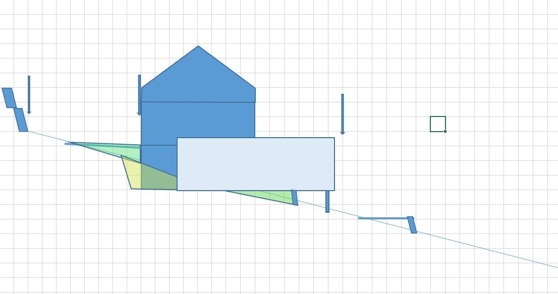 Blaues technisches Diagramm eines Gebäudes: Dachhaus auf Rechteck, grüne Dreiecke, Gitternetz.