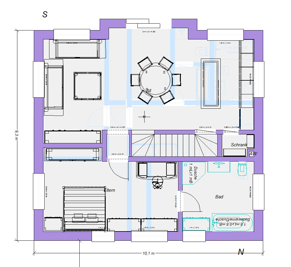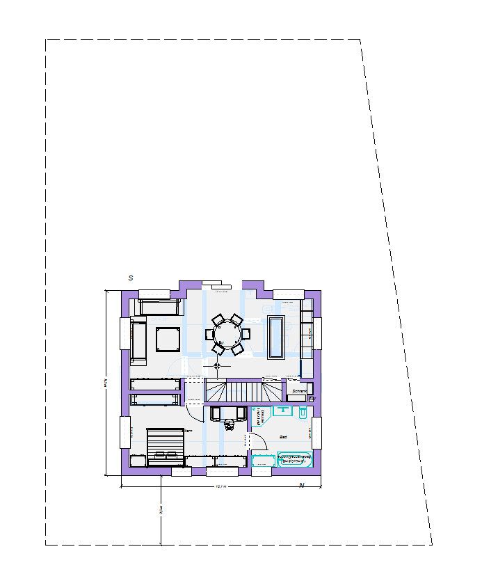 Rechne mal das neue Budget durch.Die Geschossflächenzahl ist ja keine, sondern die Grundflächenzahl, wie wir feststellen mussten. Dieses Problem hat sich damit m.E. völlig erledigt. Der TE kann 180qm bebauen, 2 stöckig - ich glaub, das kann und möchte er gar nicht ausschöpfen. Es wäre sehr hilfreich, wenn die Textfassung des B-Plans auch mal preisgegeben würde, damit wir nicht erst am Ende des Threads erfahren, was alles doch nicht geht oder geht.Ich habe meinen Vorschlag nochmals etwas zusammen geschoben, um den Geldbeutel entgegen zu kommen: