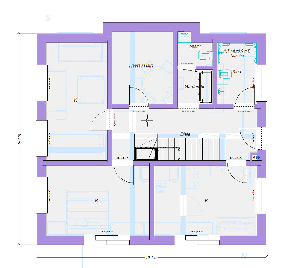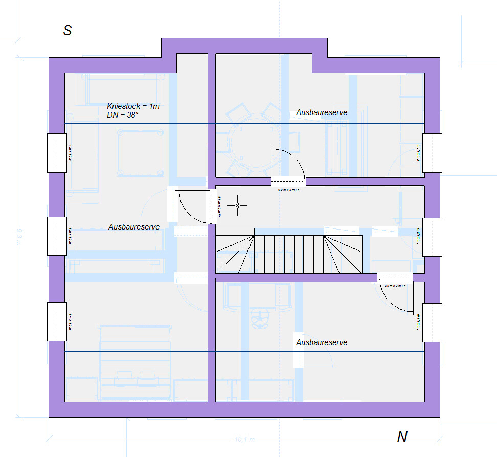 Grob überschlagen läge man so bei etwa 150qm für EG und OG. Zwillinge müssten in ein Kinderzimmer. Ob man die Ausbaureserve tatsächlich braucht, wage ich zu bezweifeln. Eventuell geht man mit dem Kniestock hier besser auf 0 und spart weiter am Dachboden. Auch die Frage, wann das erste Kind wieder auszieht.