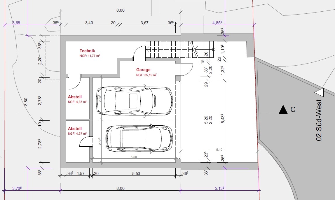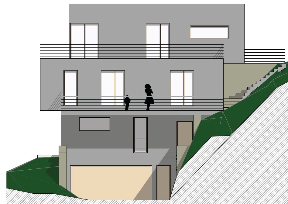 Grundstück in starker Hanglage. Ungefähr 15 m x 35 m. Haus darf nicht Breite als 8 m sein und oberstes Geschoss muss in zwei Richtungen rückspringen (Pseudo-Staffelgeschoss).