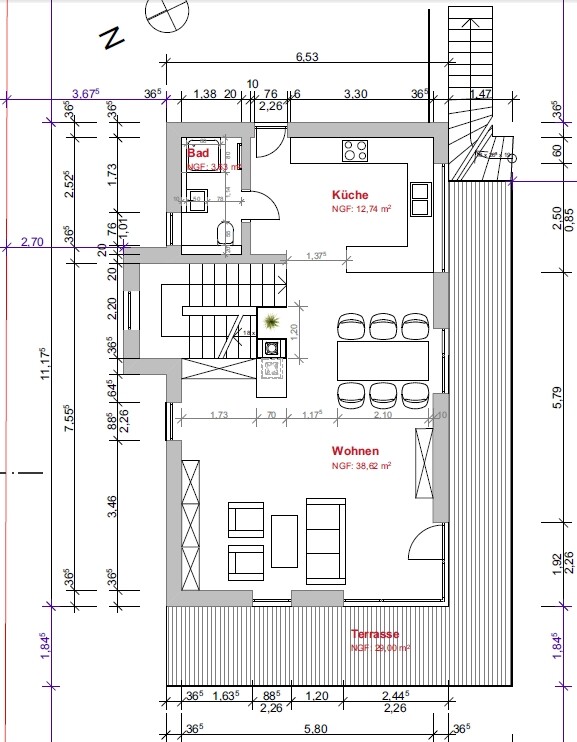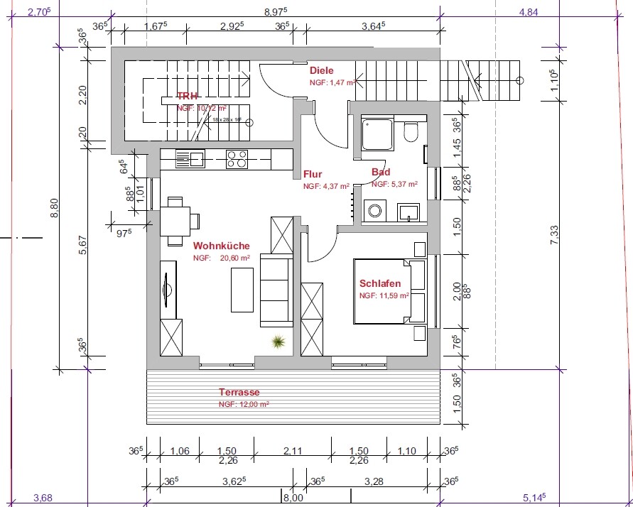 - Seitliche Dachterrasse ist mit etwas weniger als 150 cm Tiefe weder Fisch noch Fleisch. Wird vermutlich Richtung 120 cm reduziert. Vielleicht kommt da auch einfach (begrüntes?) Dach hin, falls das eine merkliche Ersparnis gegenüber Dachterrasse liefert.