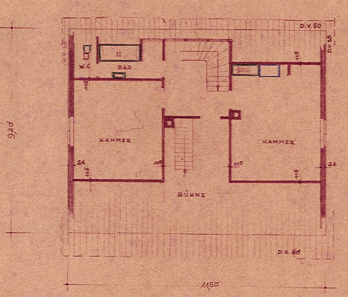 ausgebautes Dachgeschoss. Das Dachgeschoss besitzt eine eigene Küche und ein eigenes Bad, denn der Bauherr hat es damals als Wohnung für seine Mutter direkt so geplant und gebaut. Im Bauantrag (50er Jahre) sind die Zimmer des Dachgeschosses als "Kammer" bezeichnet.